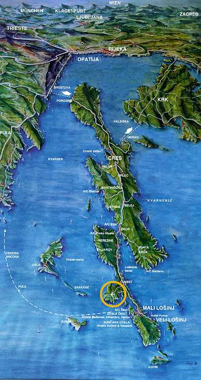 Die ca. 75 km große Insel Lošinj, ein blumen- und pinienreiches Paradies, liegt in der Kvarner Bucht, reicht aber geographisch fast bis Dalmatien. Mit ungefähr 300 Sonnentagen jährlich zählt die Insel zu den sonnigsten in Europa. Der Hauptort der Insel, Mali Lošinj, der einst wegen der Seefahrt und Schiffbaus bedeutend war, wurde aufgrund der klimatisch günstigen Verhältnisse im 19. Jh. von den Erholung Suchenden entdeckt.